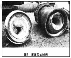 在泡沫系統管路中,較易發生堵塞的部位為泡沫管的注入端及土倉隔板上的球閥。堵塞后的球閥(如圖1)所示。堵塞后的管路有兩大特征:一是堵塞泡沫管注入端的介質多為結實了碴土;二是堵塞的球閥介質多為背襯注漿后產生的注漿液。