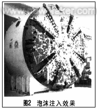 調試時,在泡沫發生器觀察管處看到,泡沫的發泡效果良好;在低壓清洗回路關閉狀態下,在刀盤位置處可看見,充分發泡的泡沫從刀盤上的泡沫注入孔噴射出來,沿平拋運動軌跡一直到掌子面上(見圖2)。